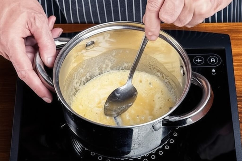W międzyczasie przygotuj sos do gotowanej golonki. Do garnka wrzuć masło, a kiedy się stopi dodaj mąkę i przysmaż, aż osiągnie jasny, złocisty kolor. Przecedź około 0,5 l wywaru z gotowania mięsa do garnka. Dodaj śmietankę i wszystko gotuj aż płyn osiągnie konsystencję sosu.