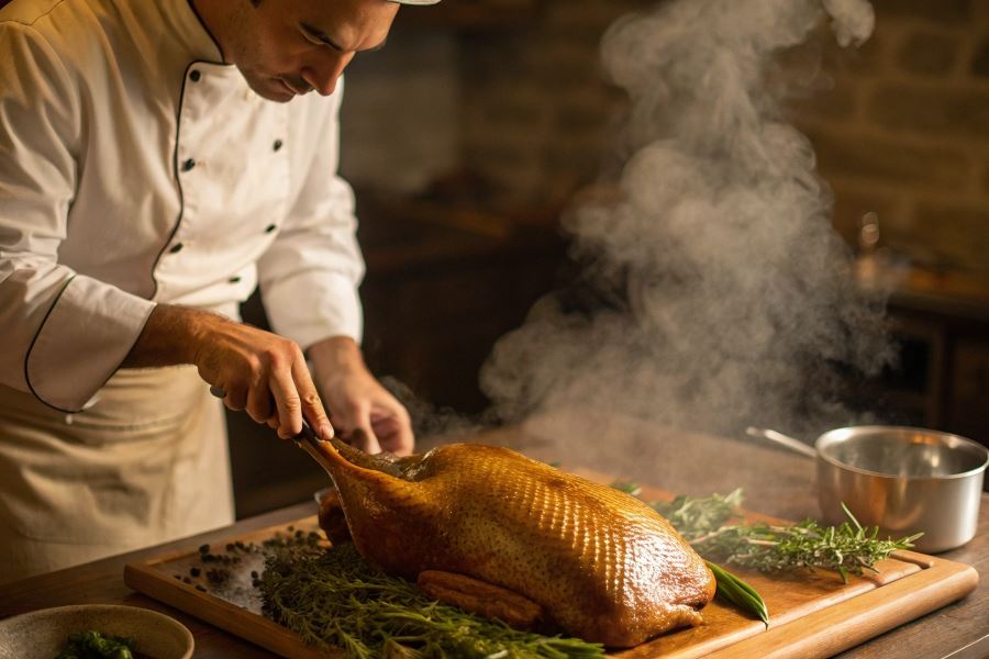 Doskonała gęsina zaczyna się od wyboru odpowiedniej gęsi. Najlepsze mięso pochodzi z ptaków w wieku 5-6 miesięcy, ważących między 4 a 6 kg. Gęsi młodsze mają delikatniejsze mięso, ale mniej tłuszczu, co może skutkować przesuszeniem podczas pieczenia. Gęsi starsze są bardziej tłuste, ale ich mięso bywa twardsze. Jakość gęsiny poznasz po skórze – powinna być elastyczna, bez przebarwień, o jasnym, kremowym kolorze.