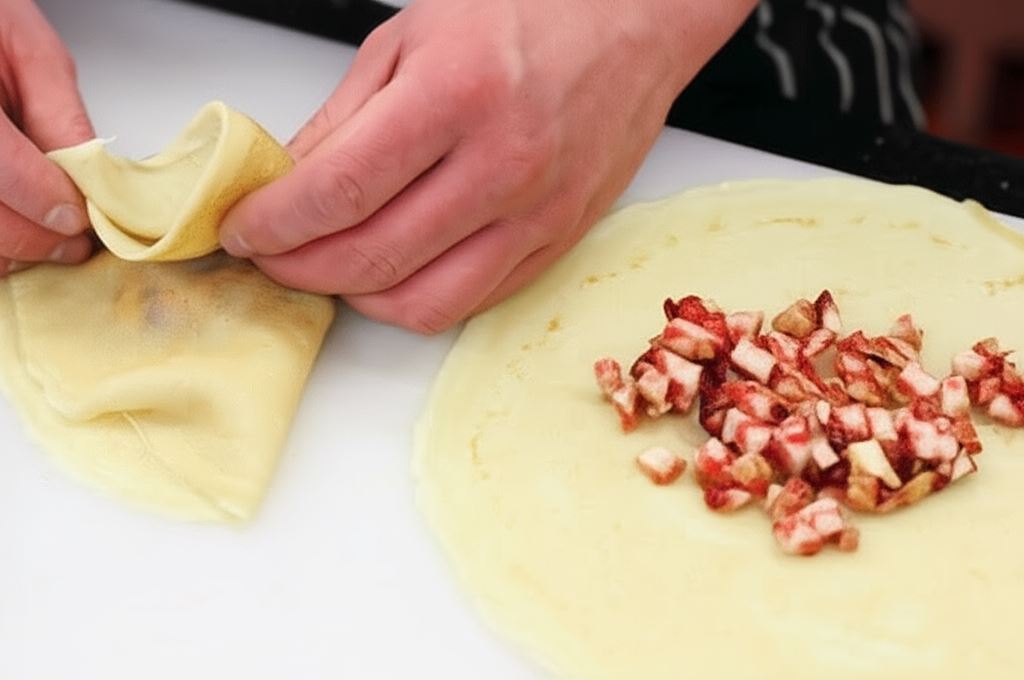 Oscypki potnij w małą kostkę i połącz w miseczce z połową przewidzianej żurawiny – potem posmaruj tym każdy z naleśników i złóż w kopertę.