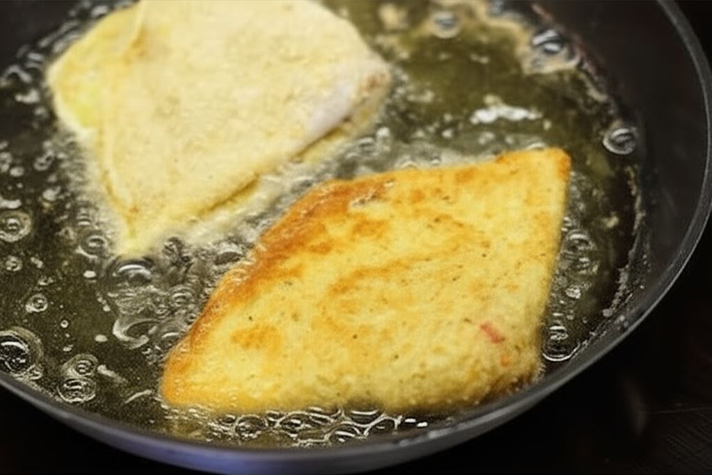 Tak uformowane naleśniki obtaczaj po kolei: w mące, rozbitym jajku i bułce tartej. Smaż na trochę głębszym, niż zazwyczaj oleju.