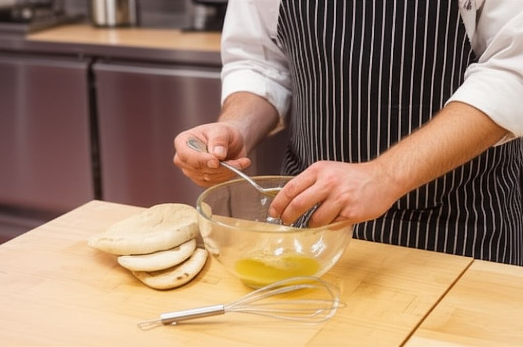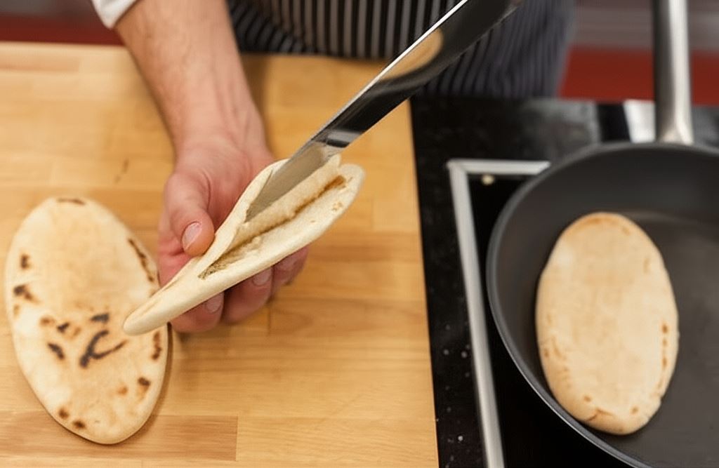 Podpiecz chlebki pita po obu stronach na suchej, gorącej patelni. Kiedy 'urosną', zdejmij je i przekrój każdy tak, by utworzyć kieszonki.
