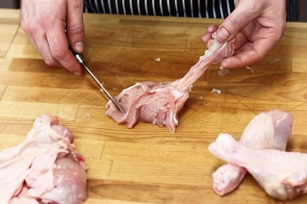 Pałki opłucz i wysusz. Następnie oddziel od kości i ścięgien. Mięso podziel na mniejsze kawałki.