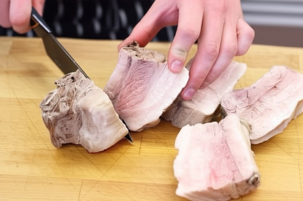 Żeberka ugotuj w wodzie z dodatkiem liści laurowych i ziela angielskiego do miękkości. Potem odcedź je, wystudź i podziel na porcje.
