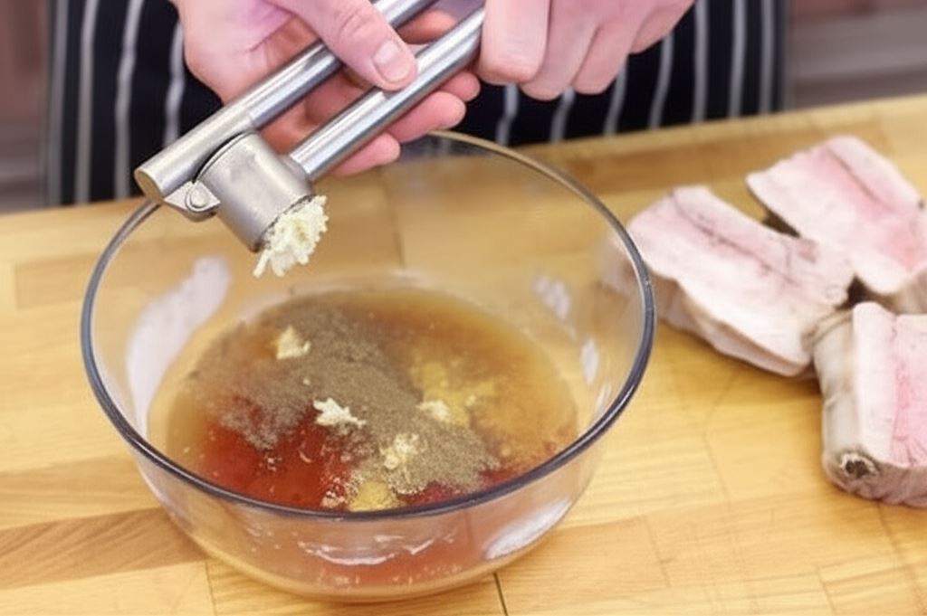 Ketchup połącz z 3 łyżkami wody z gotowania żeberek, przeciśniętym czosnkiem i przyprawami. Przygotowaną marynatą polej żeberka i odstaw na 20 minut.