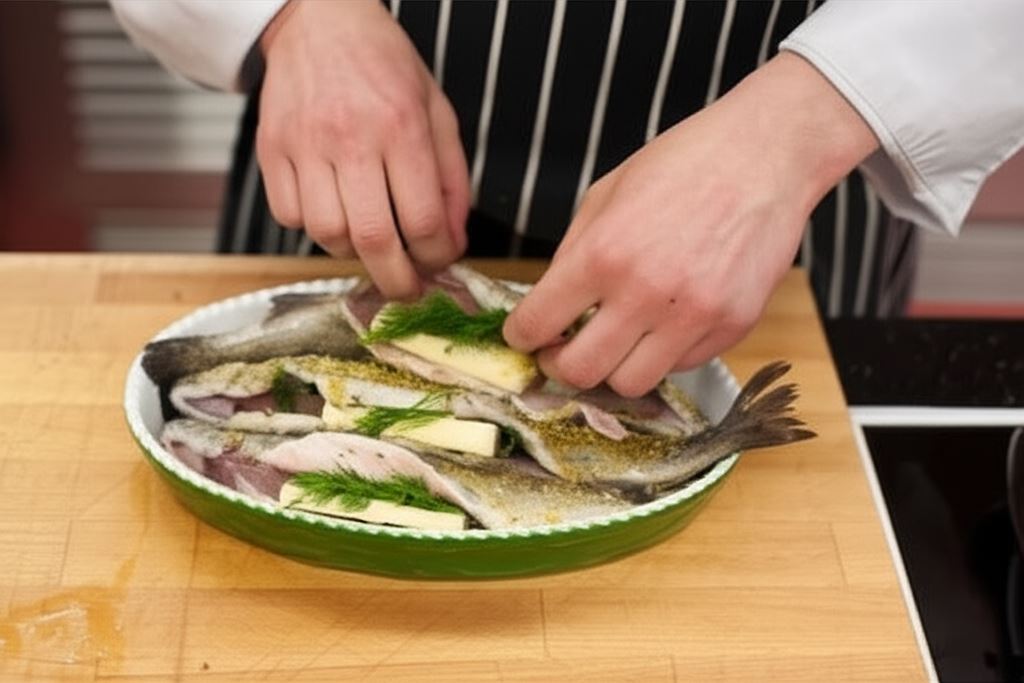 Wewnątrz włóż parę gałązek koperku i masło.