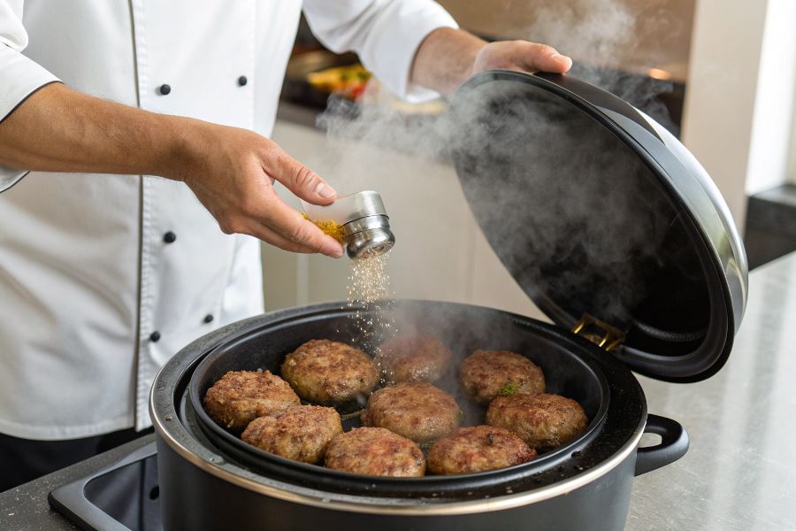 Wykorzystaj funkcję „Smażenie” przez 5-7 minut z każdej strony. Dla jeszcze lepszego efektu, po usmażeniu możesz przełączyć na funkcję „Podgrzewanie” na 5 minut, aby kotlety doszły w delikatnym cieple.