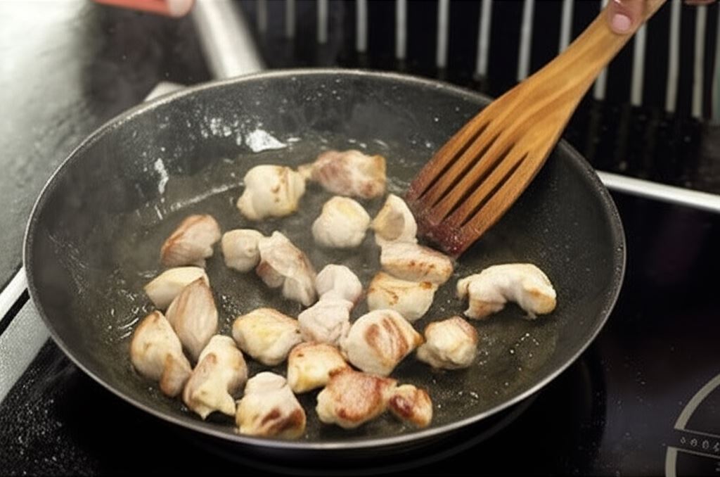 Mięso potnij w grubą kostkę i obsmaż na mocno nagrzanej patelni z olejem z każdej strony na złoty kolor.