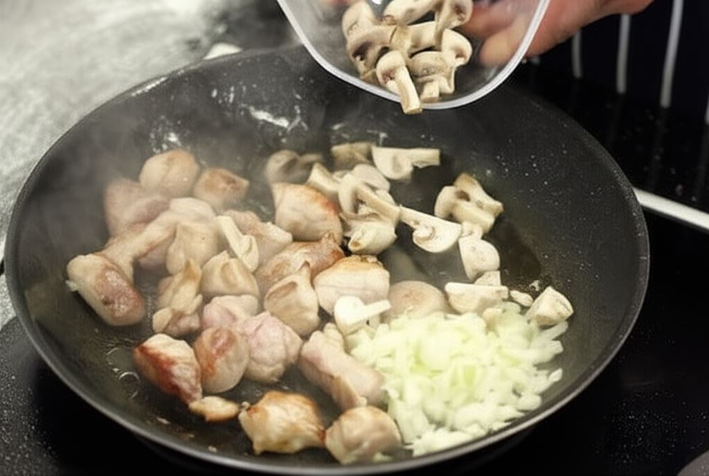 Wrzuć cebulę pokrojoną w kostkę i pieczarki pokrojone na ćwiartki. Po chwili dolej 500 wody i wsyp Fix Knorr. Duś przez około 30 minut.