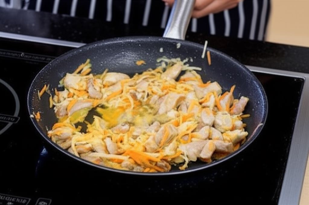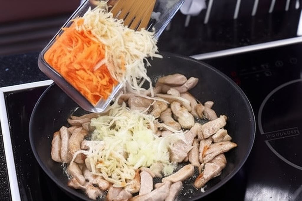 Mięso potnij w paski. Warzywa zetrzyj na grubych oczkach tarki.