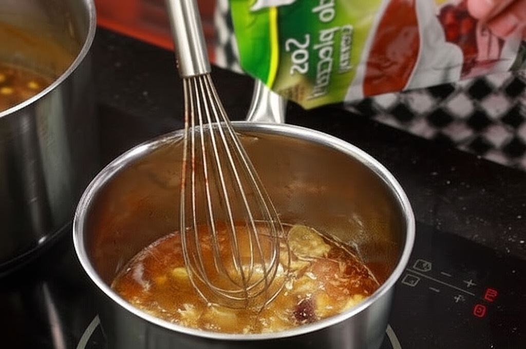 W niewielkiej ilości wody rozpuść Sos do pieczeni ciemny Knorr. Dodaj do mięsa przy końcu duszenia. Odcedzoną kukurydzę i fasolę duś aż do momentu, gdy sos będzie gęsty.