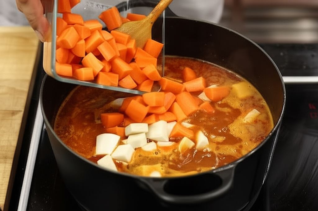 Doprowadź do wrzenia, usuń pianę z powierzchni, wsyp marchew, seler i pietruszkę. Gotuj przez około 20 minut.