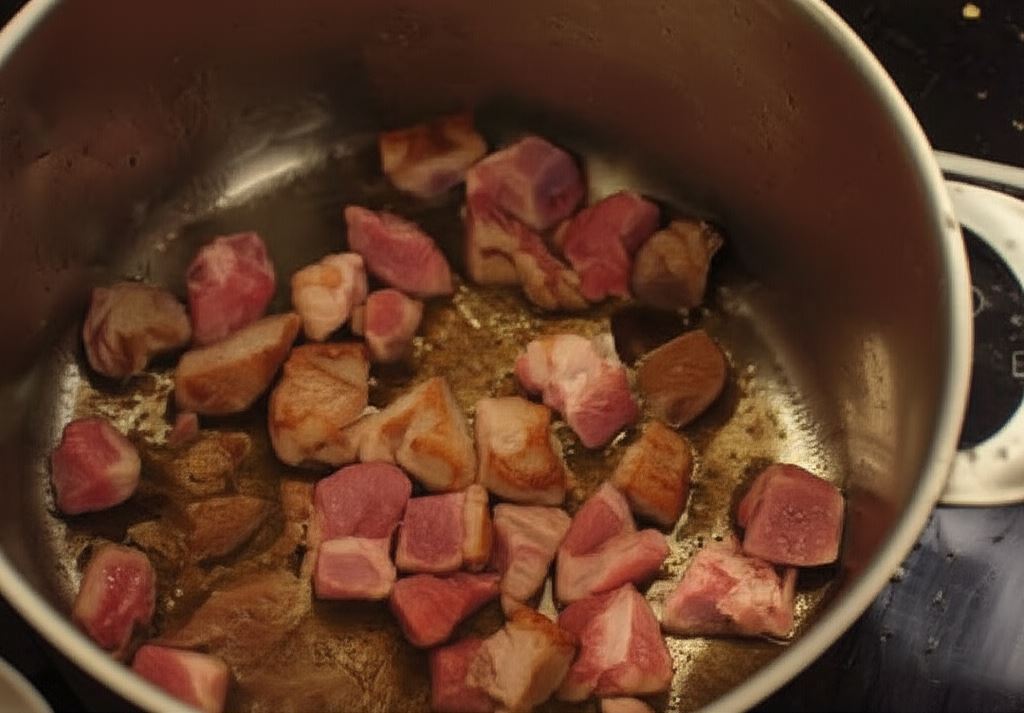 Mięso przepłucz i potnij w grubą kostkę. Następnie posyp mąką i obsmaż na rozgrzanej oliwie w garnku – usmażone mięso wyjmij z garnka.