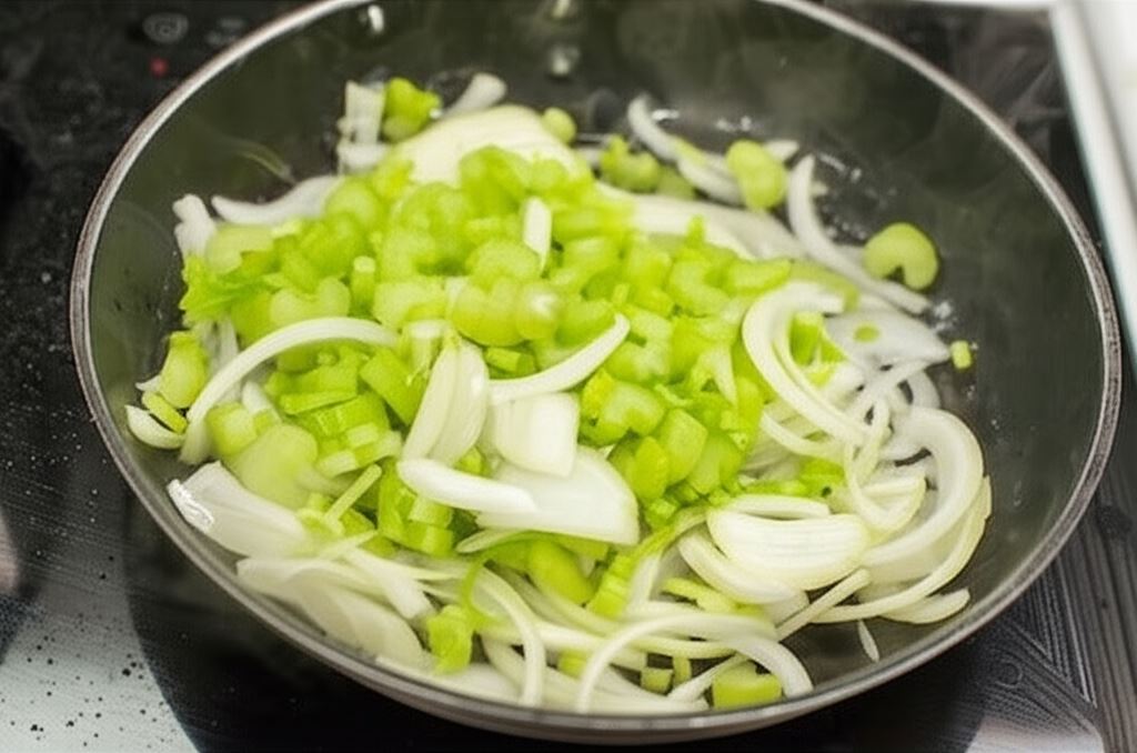 Łodygi selera naciowego potnij w plastry, a cebulę w piórka. Przysmaż całość na patelni, dodając zioła i paprykę.