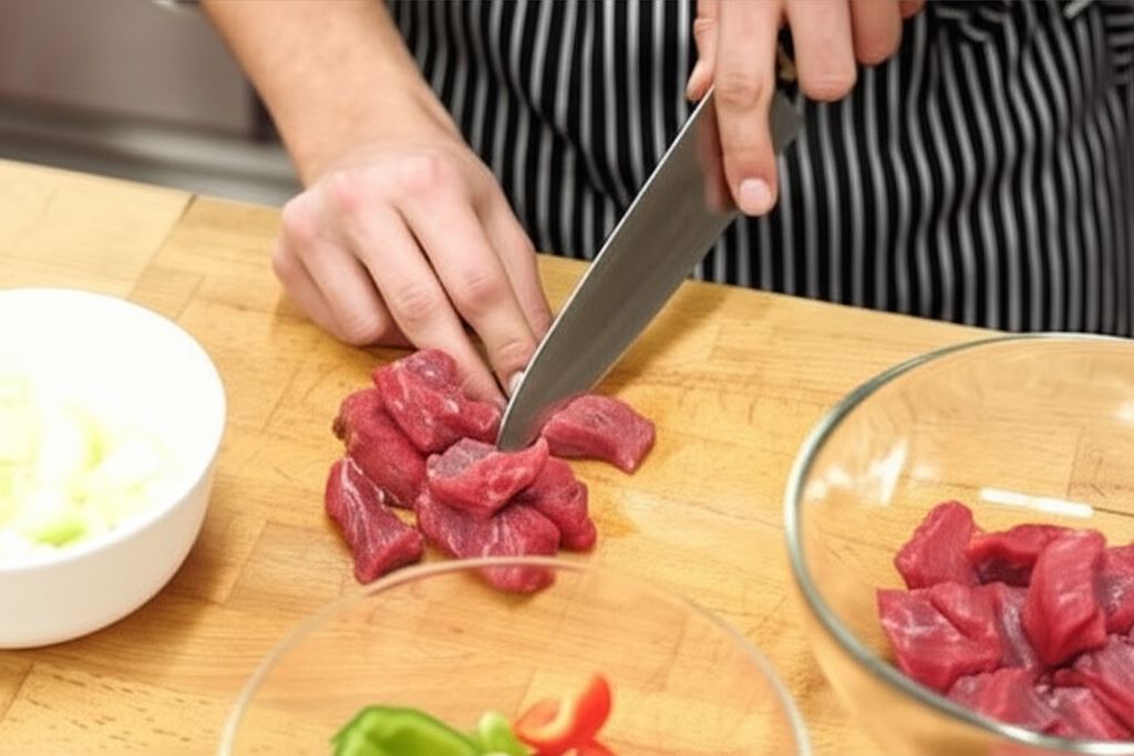 Wołowinę, paprykę oraz cebulę pokrój w duże kostki.