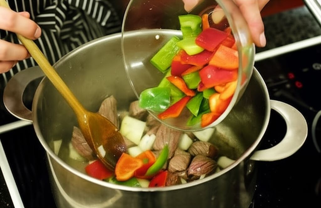 Rozgrzej olej w garnku, podsmażaj mięso, po czym wsyp warzywa. Całość smaż przez moment razem.