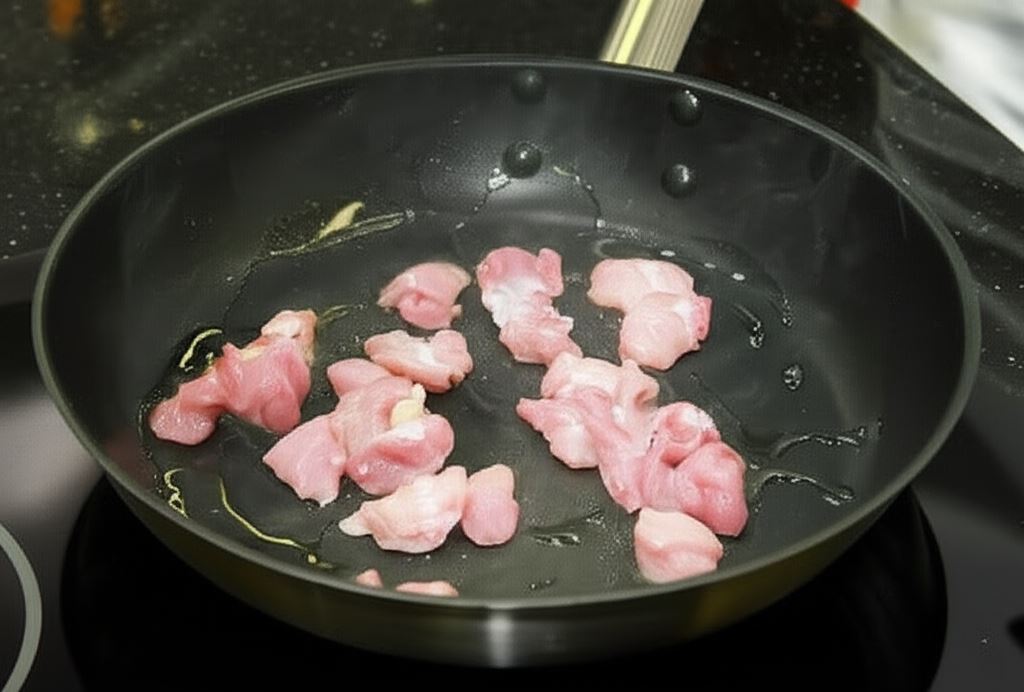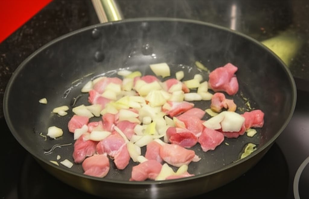 Przyrumień mięso, wsyp cebulę i smaż całość przez parę minut.