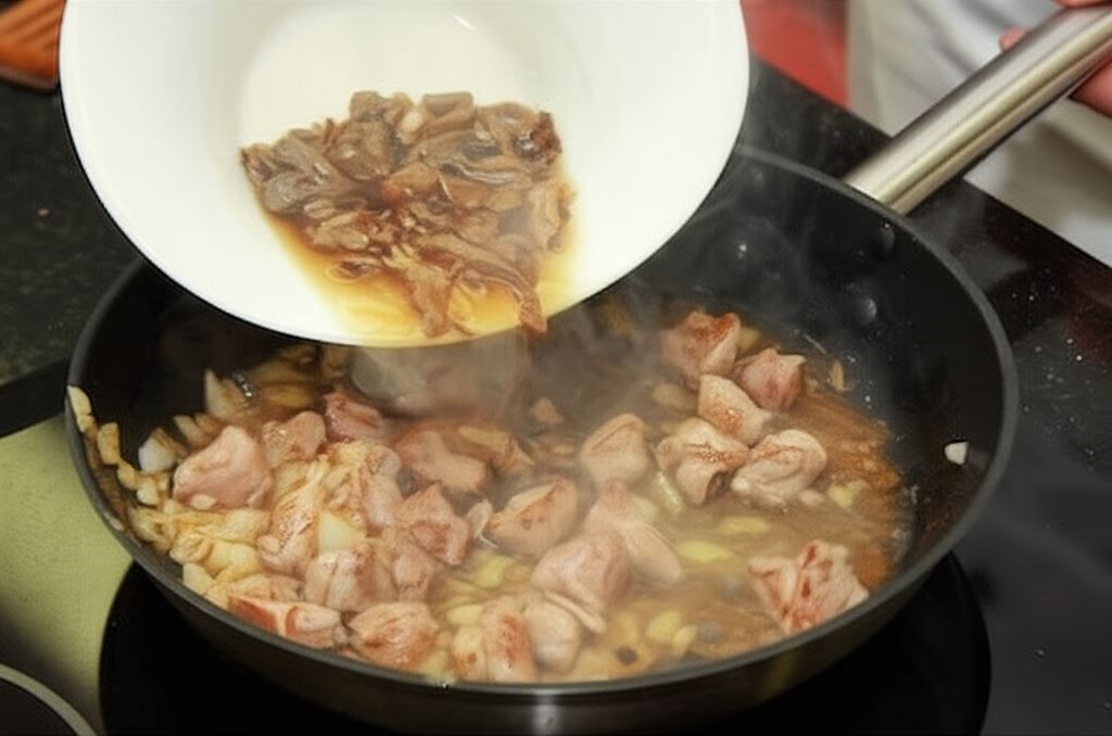 Potem zalej jedną szklanką wody, wsyp grzyby razem z wodą, w której się namaczały. Gotuj na niskim ogniu aż do chwili, gdy mięso stanie się miękkie.