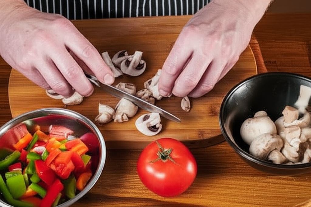 Papryki oczyść, pokrój w kostkę, ziemniaki obierz i potnij w plastry. Pieczarki podziel na ćwiartki, pomidory zdejmij ze skórki i pokrój na cząstki.
