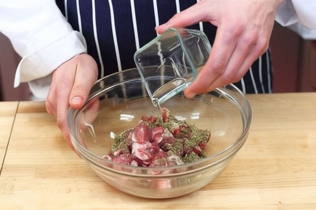 Mięso potnij w kawałki o wymiarze ok. 2 cm. Zamarynuj w oleju i przyprawach. Odłóż na 30 minut.