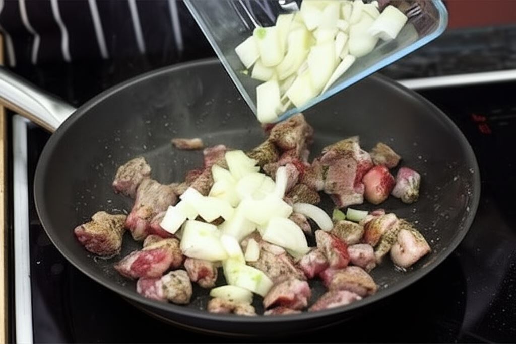 Po krótkim smażeniu wsyp pokrojoną w kostkę cebulę.