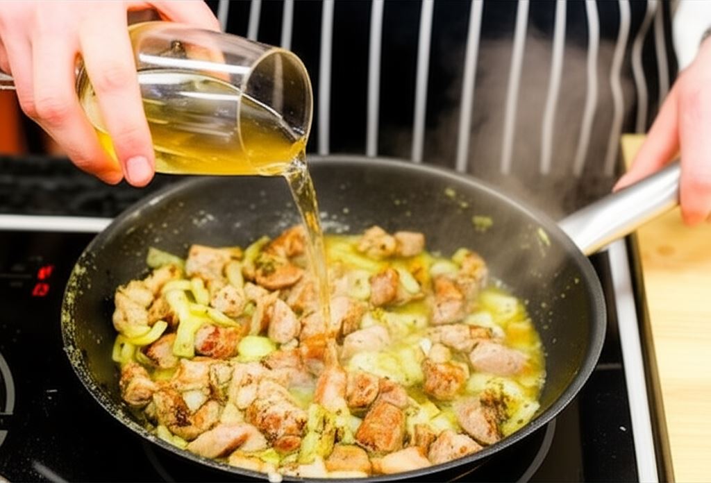 Kiedy składniki zrumienią się, dodaj na patelnię białe wino. Odczekaj aż odparuje.