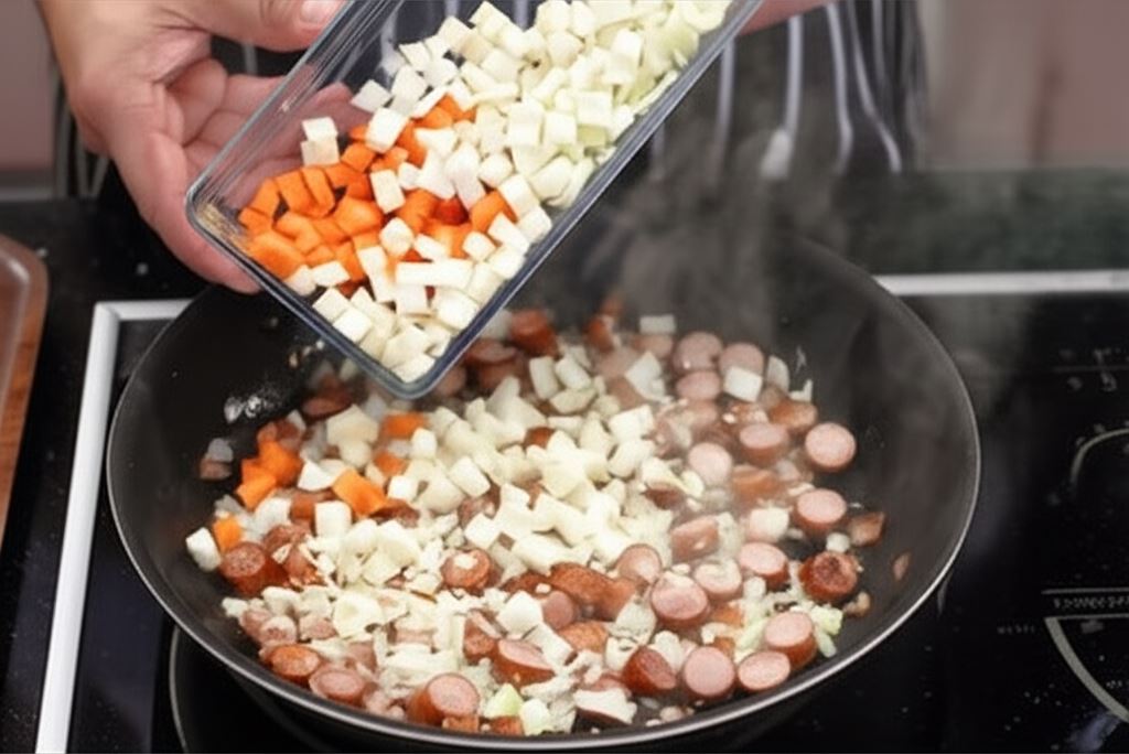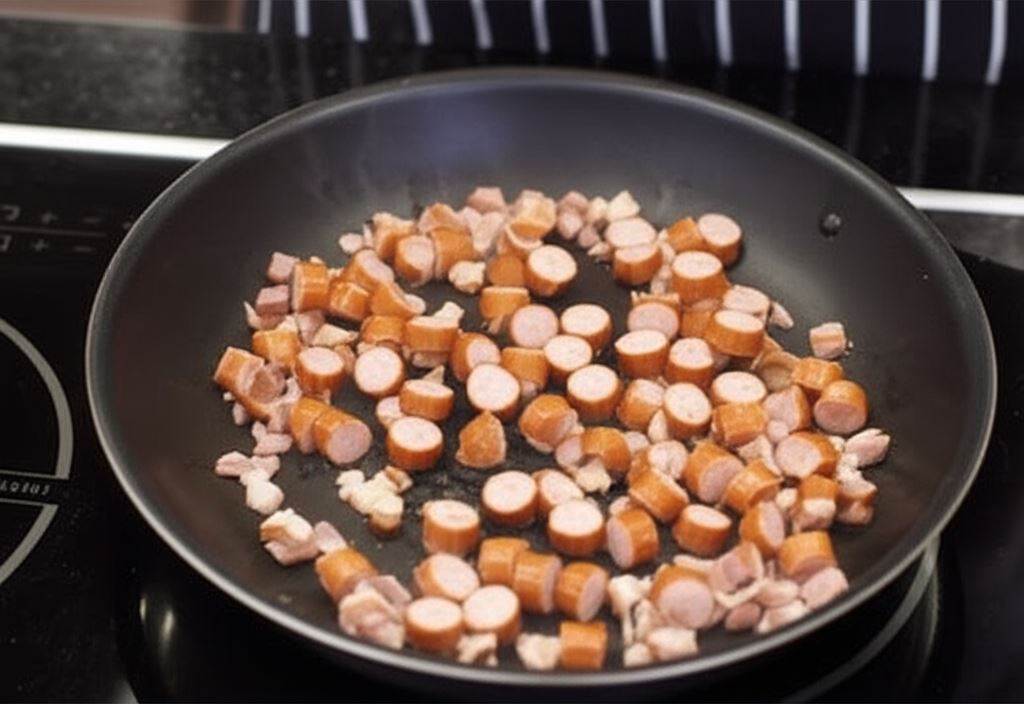 Kiełbasę potnij na plasterki, a boczek pokrój w kostkę. Wszystko przysmaż na dużej patelni bez dodawania tłuszczu.