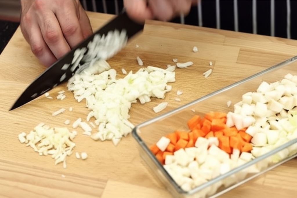Wszystkie warzywa włoszczyzny starannie umyj, obierz i pokrój w kostkę. Cebulę oraz czosnek drobno posiekaj.
