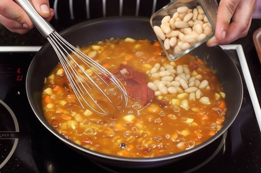 Na zakończenie wsyp koncentrat pomidorowy oraz odcedzoną fasolkę. Duś jeszcze przez około 15 minut. Przystrój natką pietruszki. Taki gulasz serwuj z kromką chleba lub bułką.
