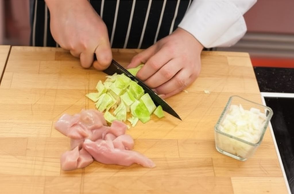 Cebulę posiekaj drobno, kapustę potnij w kostkę o boku 1 cm. W podobny sposób pokrój mięso.
