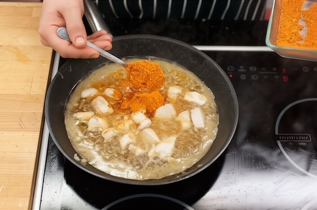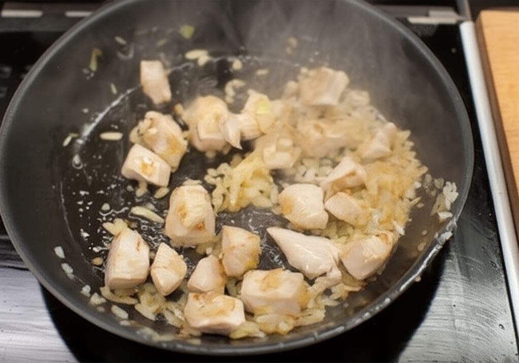 Podsmażaj kurczaka wraz z cebulą do momentu zrumienienia.