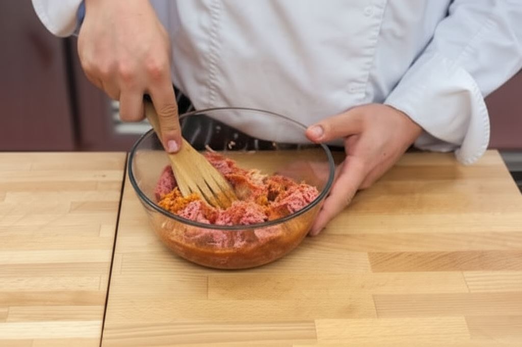 Wsyp do miski Fix Knorr (większą część z opakowania) i zalej 4 łyżkami wrzącej wody. Poczekaj moment, po czym połącz go z mięsem mielonym.