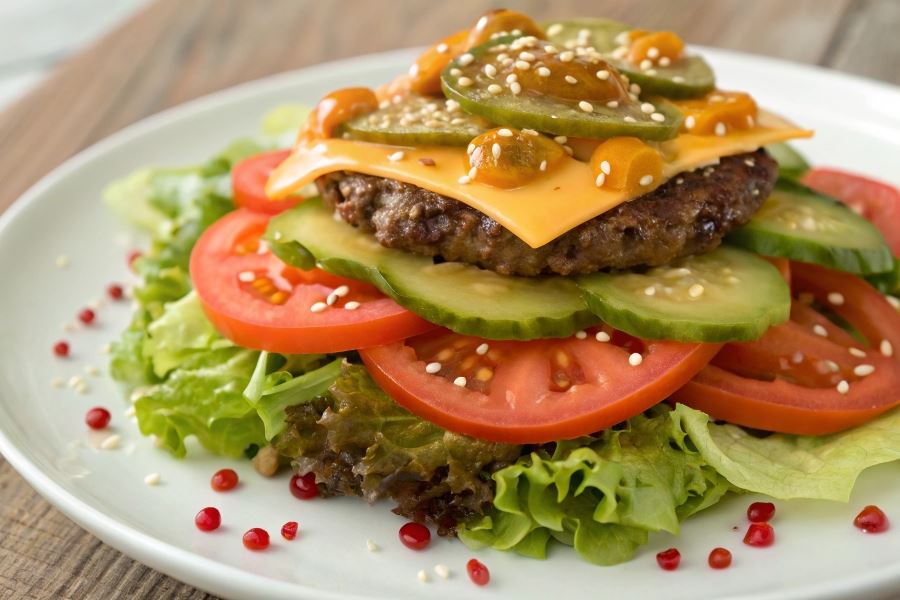 Do mięsa warto dodać charakterystyczne składniki burgera: sałatę lodową, pomidory, ogórki konserwowe, czerwoną cebulę oraz sos na bazie majonezu i ketchupu. Całość można wzbogacić prażonymi kawałkami bułki hamburgerowej, które dodadzą tekstury i nawiążą do oryginalnego dania.