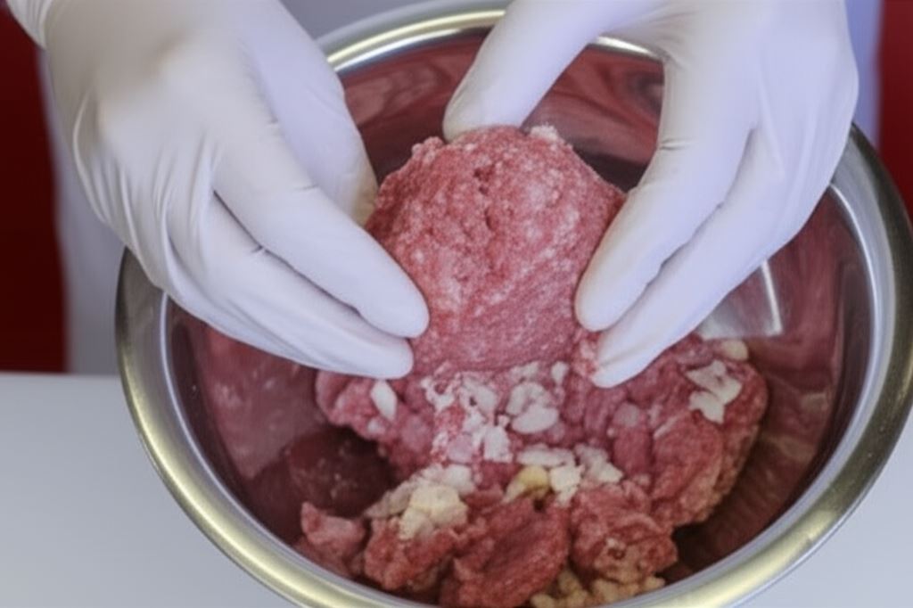 Zmiel słoninę (lub boczek) w maszynce do mięsa i połącz ją z mięsem.