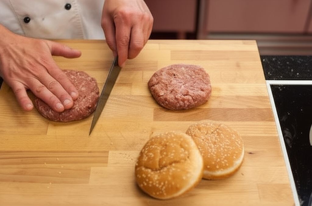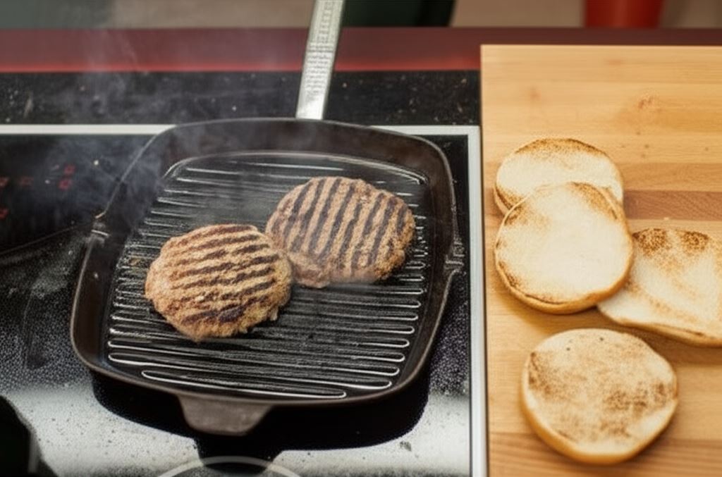 Mięso grilluj lub smaż na patelni. Bułki przetnij i podpiecz w piekarniku.