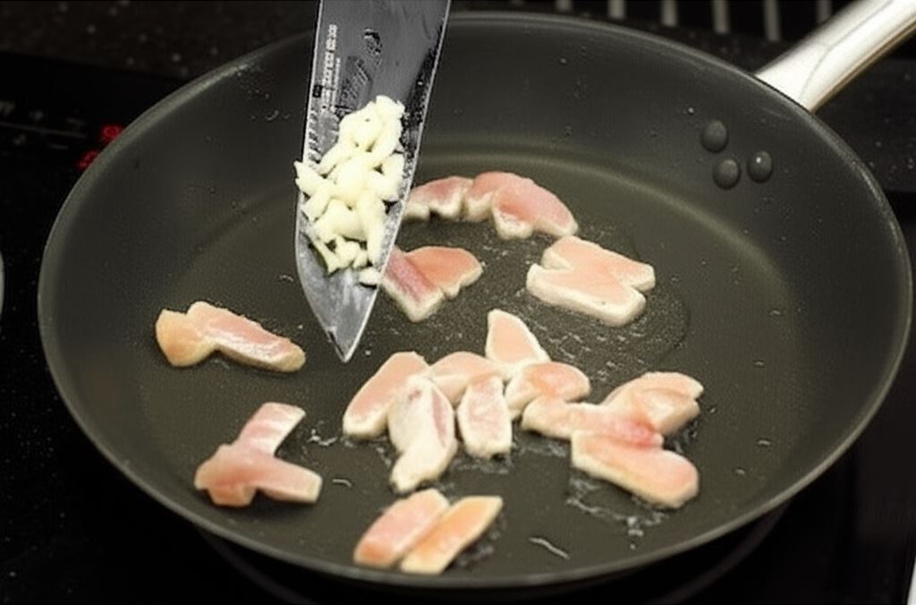 Mięso potnij w małe kawałki, na przykład w paski, i obsmaż na oleju razem z posiekanym czosnkiem, aż stanie się rumiane.