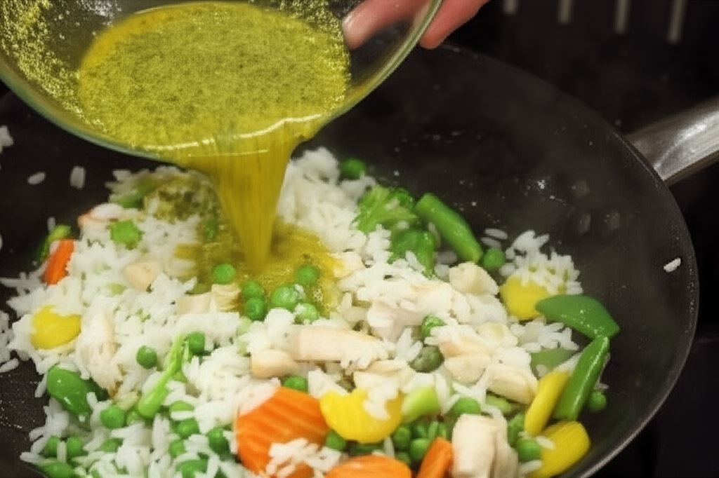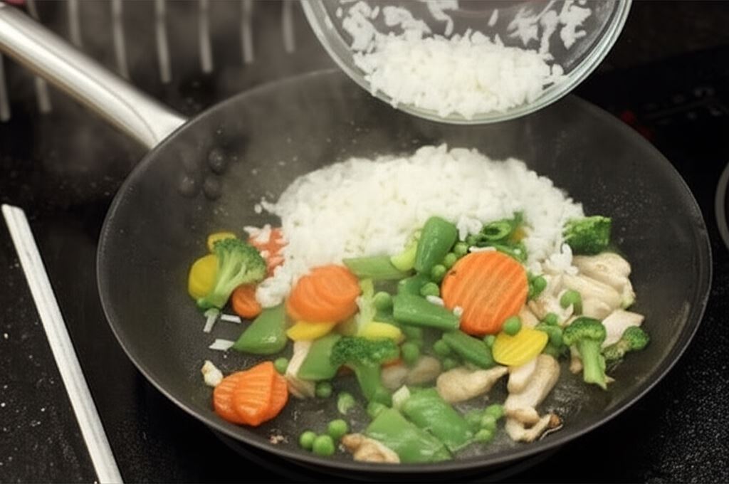 Wrzuć warzywa i ryż, następnie smaż przez 3-4 minuty. Starannie wymieszaj.