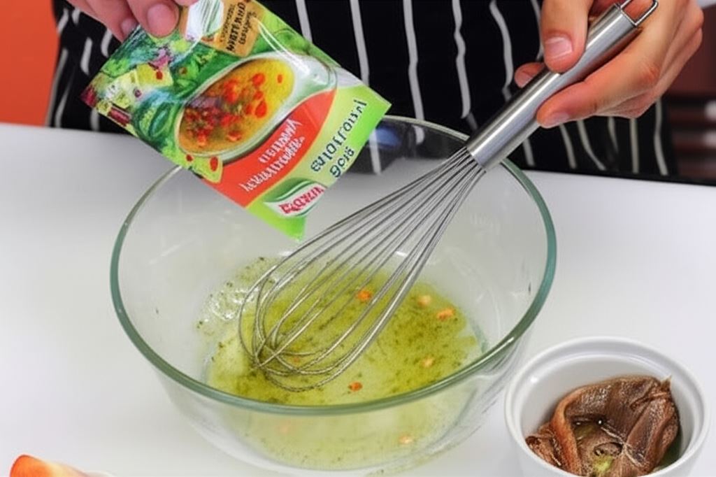 Posiekaj fileciki sardeli, w miseczce połącz sos sałatkowy Knorr z niewielką ilością wody i oliwą. Do sosu wsyp sardelę.