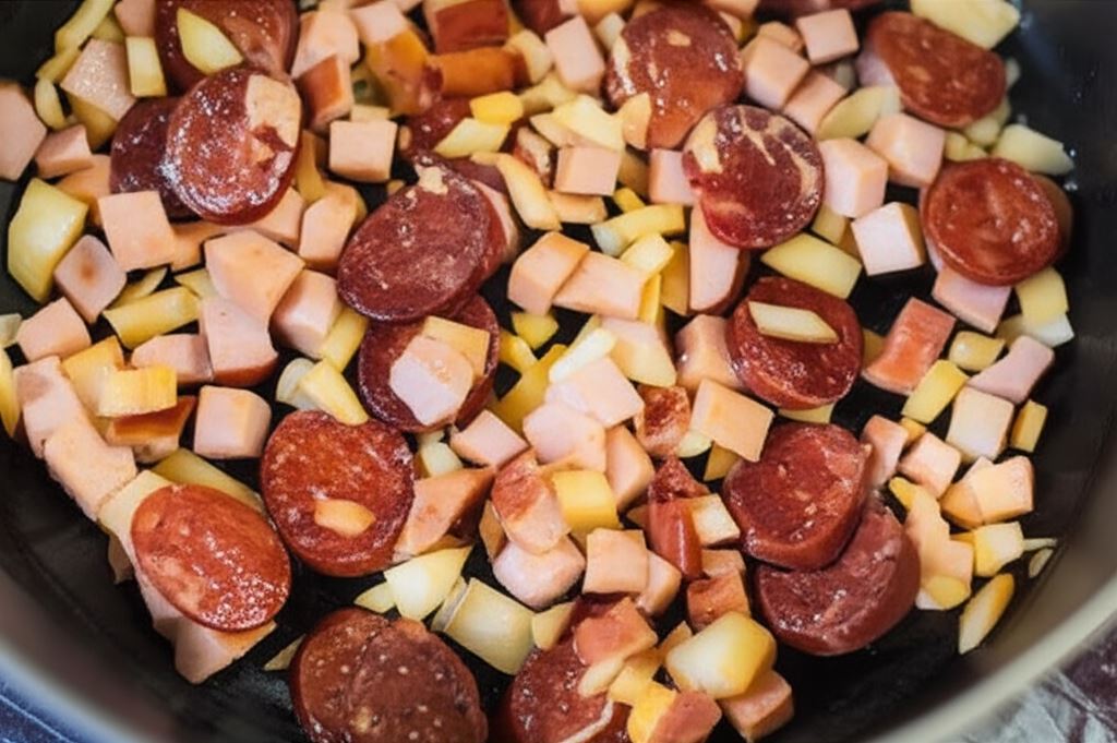 Kiełbasę potnij na plastry i obsmaż w nagrzanym garnku, boczek oraz cebulę pokrój w kostkę, wrzuć do garnka i smaż wspólnie 5-6 minut.