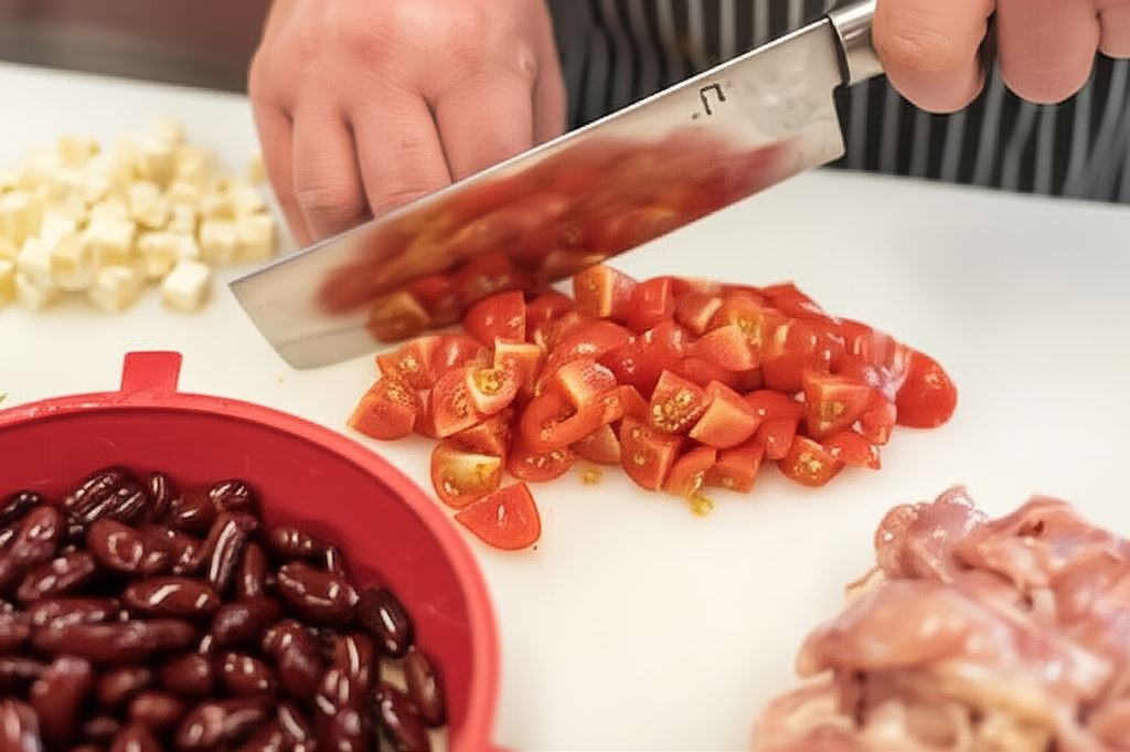 Mięso z kurczaka podziel na kawałki, ziemniaki i pomidory pokrój w kostkę 1x1 cm. Fasolę i kukurydzę odcedź na sitku. Kolendrę posiekaj na drobno.