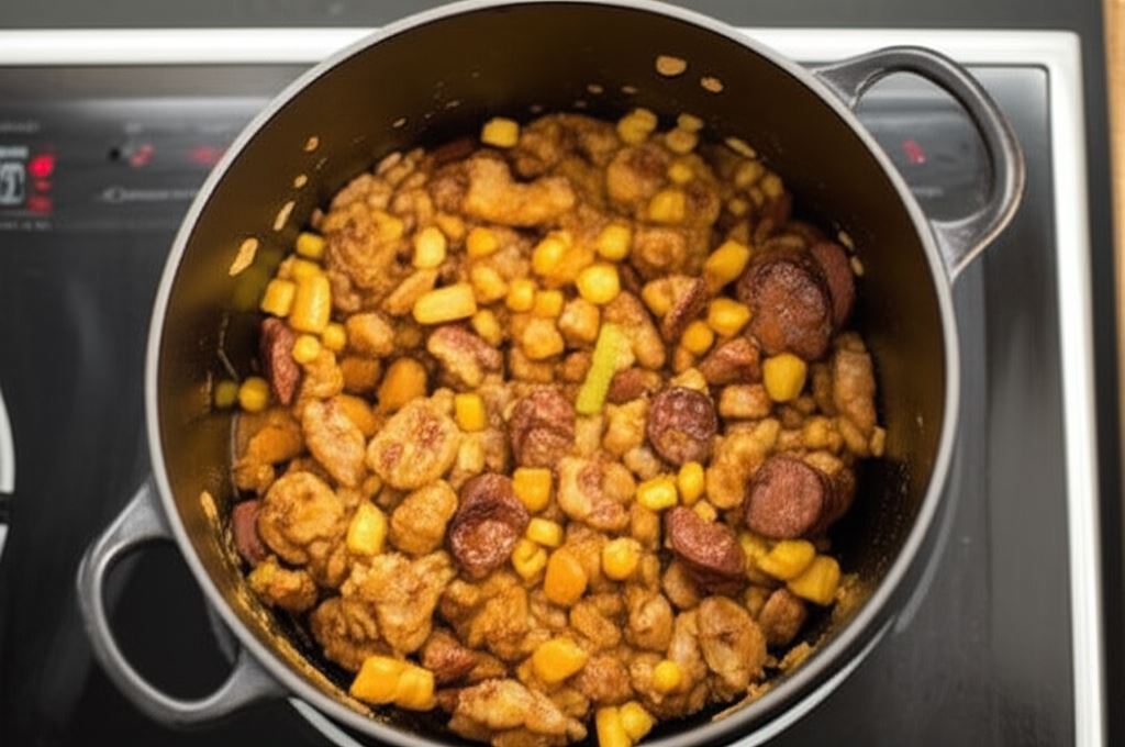 Do garnka z chorizo i boczkiem wsyp mięso kurczaka, ziemniaki i przyprawy. Całość dokładnie wymieszaj i smaż przez 3 minuty na silnym ogniu. Następnie zalej wszystko bulionem i zagotuj. Przykryj garnek, zredukuj ogień i gotuj przez 15 minut.