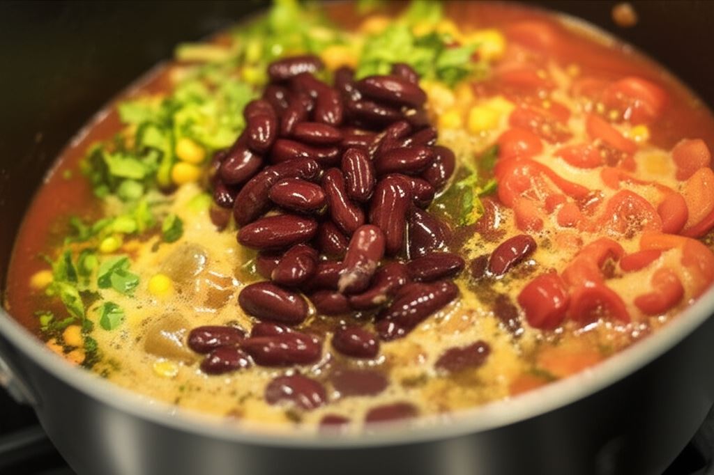 Po upływie tego czasu wrzuć do zupy kukurydzę, fasolę, pomidory i posiekaną kolendrę. Gotuj przez kolejne 5 minut i serwuj.