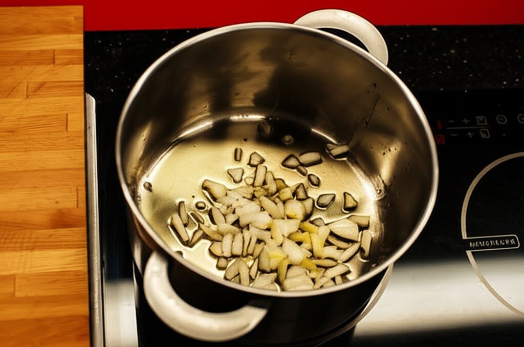 Cebulę i czosnek posiekaj w kostkę. Potem zrumień je w rondlu na oliwie.