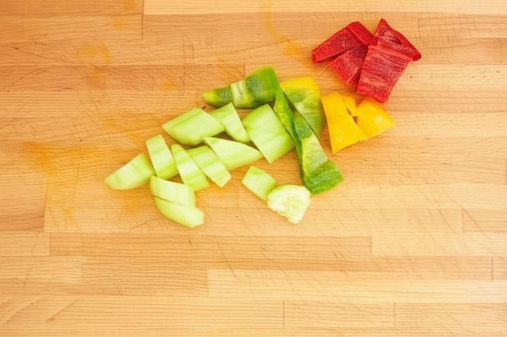 Paprykę oczyść z nasion, opłucz i pokrój na mniejsze części. Obierz ogórek i także podziel go na mniejsze kawałki.