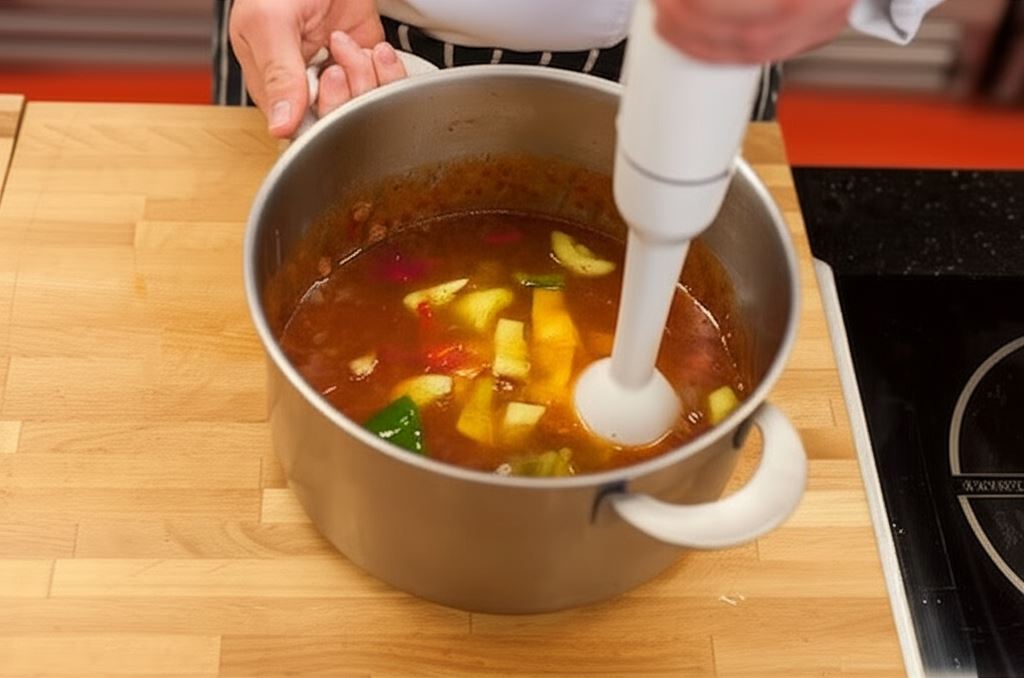 Nieprzetworzone warzywa wsyp do uprzednio sporządzonego sosu. Dolej 0,5 l wody (lub bulionu mięsnego albo warzywnego) i zblenduj zupę.
