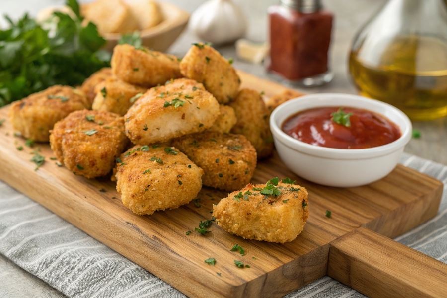 Marynowanie nie tylko nadaje smak, ale również zmiękcza strukturę mięsa, dzięki czemu nuggetsy pozostają soczyste nawet po usmażeniu.