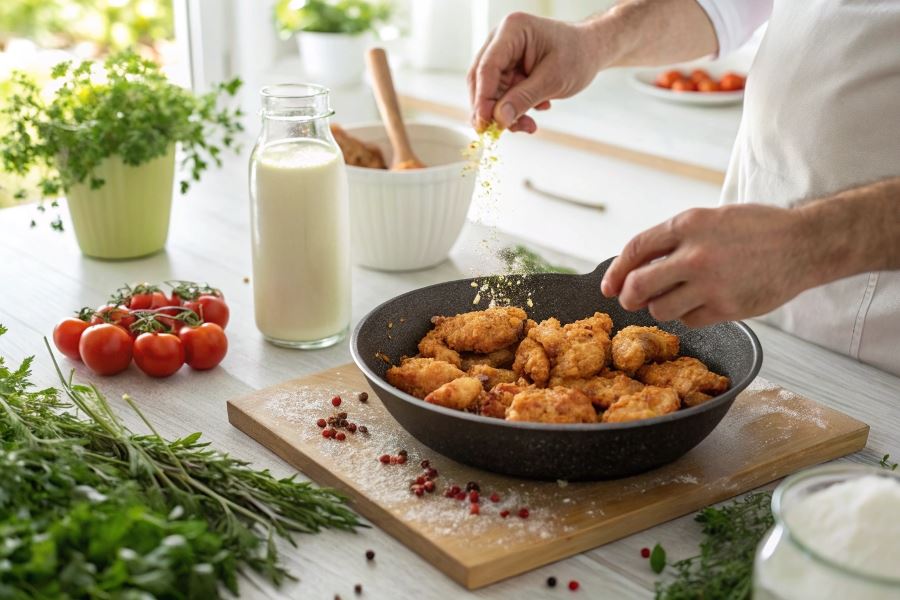 Marynata maślankowa to podstawa doskonałych nuggetsów. Połączenie maślanki z czosnkiem, solą, pieprzem i papryką tworzy bazę, która nadaje mięsu wyjątkową kruchość. Sekret tkwi w kwasowości maślanki, która naturalnie zmiękcza włókna mięsne i pozwala przyprawom głęboko przeniknąć do mięsa. Profesjonalni kucharze dodają często szczyptę cukru, który wspomaga karmelizację panierki podczas smażenia.