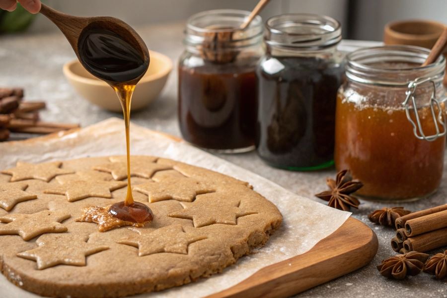Syrop klonowy to ekskluzywny zamiennik o wyrazistym, karmelowym posmaku. Dodaje pierniczkom delikatnej słodyczy i charakterystycznego aromatu, który doskonale komponuje się z przyprawami korzennymi. Przy zastępowaniu miodu syropem klonowym stosujemy proporcję 1:1, jednak warto zmniejszyć ilość dodawanego cukru o około 25%.