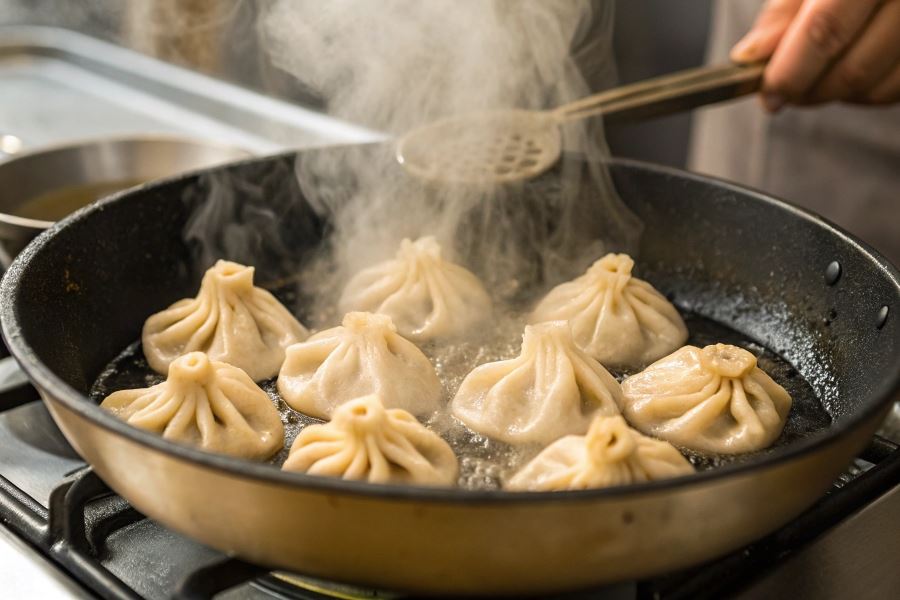 Chinkali są gotowe, gdy ciasto staje się złociste i lekko chrupiące na spodzie, a farsz jest całkowicie rozgrzany (temperatura wewnętrzna powinna osiągnąć 75°C). Najlepszym sposobem sprawdzenia jest delikatne naciśnięcie – prawidłowo usmażone chinkali powinny być sprężyste, a przy nakłuciu powinien wypłynąć gorący, klarowny sok.