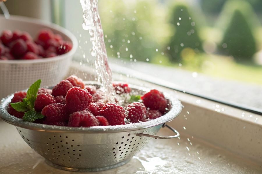 Profesjonalna wskazówka: Dodaj łyżeczkę soli do wody przed włożeniem malin – pomoże to wypłoszyć drobne owady ukryte w zagłębieniach owoców bez wpływu na smak.