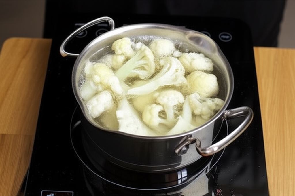 W garnku doprowadź wodę do wrzenia, wsyp sól, cukier i kalafior. Gotuj przez 5 min, po czym odcedź.